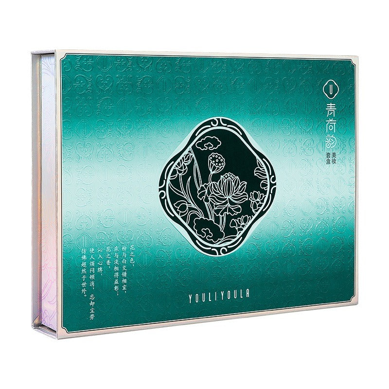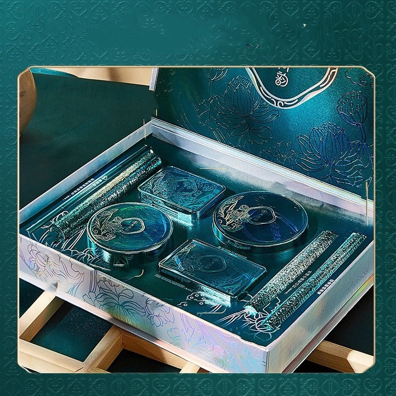 This 8-piece makeup set features an air cushion foundation, lipstick, eyeshadow, and more, all in a coordinated box. Designed for oil control, concealing, and an even skin tone. Includes BB cream, honey powder, concealer, and other essentials. Ideal for anyone wanting a complete, stylish Chinese-inspired beauty kit.